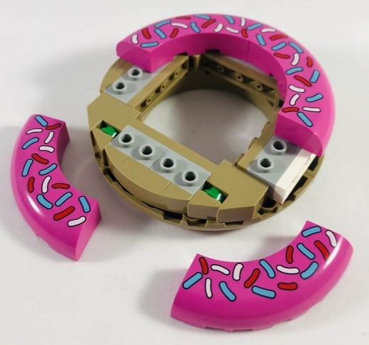 Setin asıl odak noktası diyebileceğimiz donut baskılı kavisli parça ise bu sete özel ve donut da aşağıda görebileceğiniz üzere, bir SNOT tekniği ile (LEGO yapım parçası çıkıntılarının üstte olmadığı bir şekilde) inşa ediliyor.