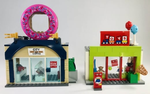 İlk modellerimiz, setin binalarını oluşturan donut dükkanı ve oyuncak mağazası. Önden baktığımızda tabii ki dev donut en çok dikkat çeken nokta. Bir donut’a göre ortasındaki boşluk biraz büyük, daha çok bir simide benzemiş. Donut dükkanındaki bir diğer dikkat çekici nokta ise yaratıcı bir şekilde dükkanın ön yüzüne eklenmiş olman LEGO Technic çamurluk parçası. Bu arada, donut dükkanı, LEGO dünyasının kahve zinciri “The Coffee Chain”e değil de yeni bir marka olan “City Coffee”ye ait.