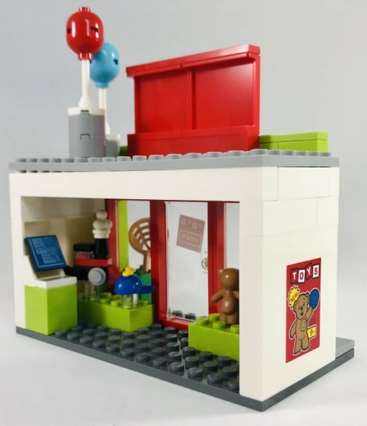 Ne yazık ki oyuncak dükkanı bu açıdan daha zayıf. Vitrinden görünen tren ve ayıcık dışında içeride sadece, bu yıl ilk defa gördüğümüz ve 60234: LEGO City People Pack – Fun Fair setinde de yer alan pervaneli şapka yer alıyor. Kasanın yerleşimi ise eğreti olmuş.