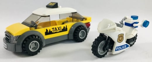 Bunlar dışında setin içerisinde gerçekten de her sınıftan bir araç yer alıyor. Bu araçların ilki olan polis motosikleti, esnekliği daha düşük olan yeni nesil motosiklet iskeletini kullanıyor ve oldukça standart. LEGO City setlerinde benzer bir taksiyi en son 2014 yılındaki 60050 Train Station setinde görmüştük, bu yüzden araç tercihinin jenerik bir otomobil yerine taksiden yana kullanılması çeşitlilik açısından faydalı olmuş.