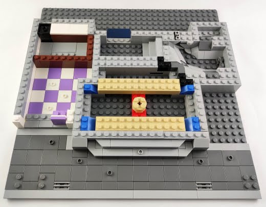 Klasik 32×32 zemin üzerine inşa edilen set, yüksek girişe sahip bir set olduğu için öncelikle bodrumu inşa ediyorsunuz. Bodrum kat, üzerindeki yapılardan sonra neredeyse tamamen görünmez olsa da sağda yer alan kaşık ve tünel, modüler binaların her noktasında gördüğünüz canlılığın ilk örneği olarak karşımıza çıkıyor. Yazının ilerleyen kısımlarında değineceğimiz üzere, bu setin de 10251 Brick Bank setine benzer bir hikayesi var.