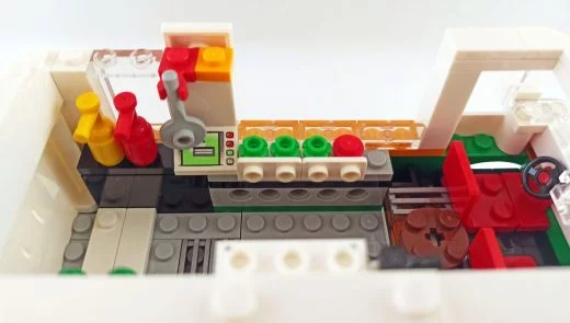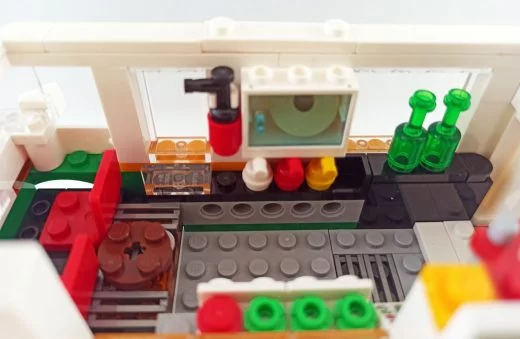 İç mekanda bizi tüm eşyaları ve malzemeleriyle eksiksiz bir burgerci karşılıyor. Burada setin 8 çıkıntı genişliğinde olmasının da büyük etkisi var. (City setleri 6 çıkıntı genişliğinde olduğu için daha az alana sahip oluyor.) Setin lastikleri normal boyutta olsaydı dahi, genişliğinden ötürü ölçek olarak şehrinize büyük gelebilirdi.