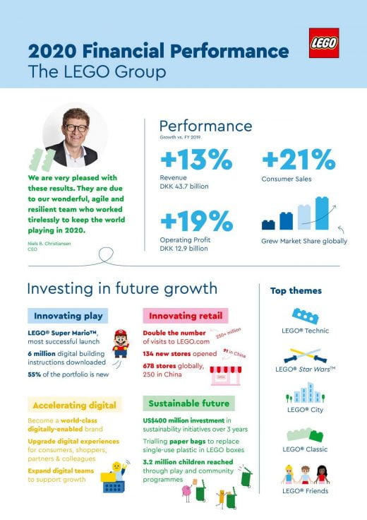 LEGO Group, bugün, 2020 faaliyet raporunu ve finansal sonuçlarını yayınladı. Sonuçlarda özet olarak, güçlü tüketici talebinin, tüketici satışlarının, gelirlerin ve işletme kârının çift haneli büyümesinin yanı sıra önemli pazar payı kazanımları ile sonuçlandığı ve uzun vadede sürdürülebilir büyüme sağlamak için tasarlanan stratejik yatırımların devam ettiği belirtildi.