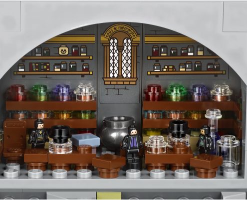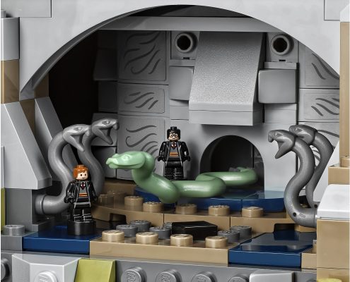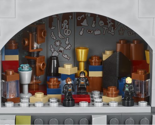 - Hogwarts Castle features the Great Hall with buildable ‘stained glass windows’, house banners, benches, tables, flaming torches and moving staircases; potions classroom with racks of jar elements; Defence Against the Dark Arts classroom with assorted potion jars, gramophone and a closet containing a boggart; Chessboard Chamber with chess piece elements; Room of Requirement with assorted elements, including the Goblet of Fire and the vanishing cabinet; Chamber of Secrets with the Basilisk and Tom Riddle’s Diary; hidden Devils Snare room with vine elements; Gryffindor common room with fireplace and seating; Professor Dolores Umbridge’s office with desk, chair and pink furnishings; library with bookcase and desks; and Professor Dumbledore’s office with the Griffin statue entrance and Memory cabinet.