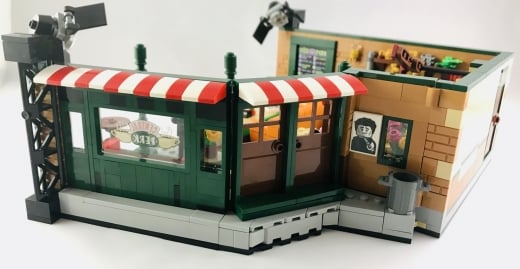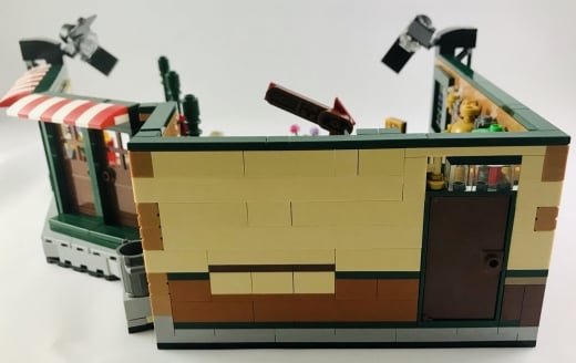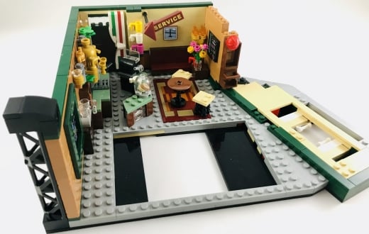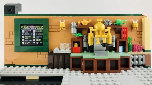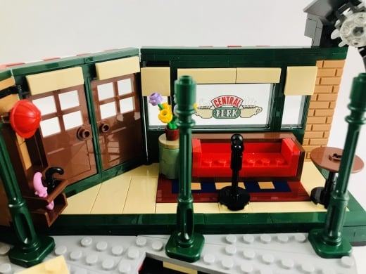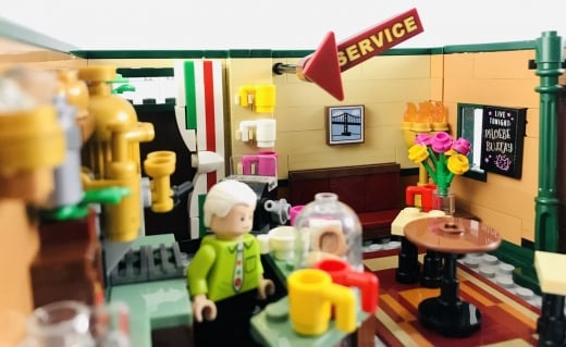 Kafenin arka tarafında yer alan “Service” işareti, perde ve duvara asılı fincanlar yine aslına oldukça sadık ve LEGO yapım parçaları ile başarılı bir şekilde tasvir edilmiş. Perdenin tasarımı benzer tasarımlar düşünenler için de ilham kaynağı olabilir. Phoebe’nin performansının duyurusu ve arkada asılı resim de diziye göz kırpan diğer detaylar.