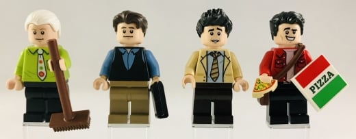 İlk grubumuz soldan sağa Gunther, Chandler Bing, Ross Geller ve Joey Tribbiani’den oluşuyor. Gunther yan bir karakter olsa da tasarımına özen gösterilmiş ve dizide gördüklerimiz gibi canlı renkli bir gömlek ve eğlenceli bir kravata sahip. Chandler’ın tasarımı daha sade olsa da yüz ifadesi tam anlamıyla eşsiz ve aslını iyi bir biçimde yansıtıyor. Ross da yine aslına sadık bir kıyafete ve saç parçasına sahip. Joey’nin ise yine yüz ifadesi en dikkat çekici noktası. Çantası da setteki bir çok detay gibi diziye göz kırpıyor.