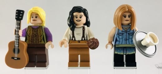 İkinci grubumuz da soldan sağa Phoebe Buffay, Monica Geller ve Rachel Green’den oluşuyor. Diğer minifigürlerin tasarımı tek bir bölümü baz almasa da Phoebe’nin kıyafeti ve gitarı nokta atışı bir şekilde 1. sezonun 7. bölümünü referans alıyor. Monica’nın da gövde baskısı aslına oldukça sadık olanlardan. Rachel için Central Perk’e uygun olarak garson kıyafeti tercih edilmiş ve bu rengi bu sete özel saçı aslına sadık. İlginç bir nokta ise, erkek minifigürlerin kafa parçaları bu sete özelken, kadın minifigürler için mevcutta olan kafa parçalarının kullanılmış olması.