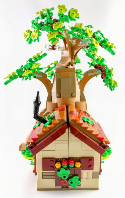 Ev ise iki yana açılan bir kulübe formunda ve dışarıdan aslına oldukça sadık. Tabii bununla birlikte, setin asıl odağının ağaç olması sebebiyle ölçek olarak küçük. Arkadan baktığınızda bu durum biraz daha net belli oluyor.