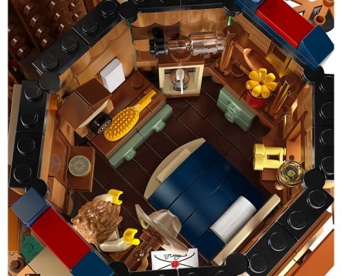 - Main bedroom cabin features a buildable bed, and assorted elements including hidden scissors (as a reference to the fan creator’s day job as a hairdresser), ship in a bottle, compass, clock plus a balcony with a hand-operated, wind-up crane to lift items up to the cabin.