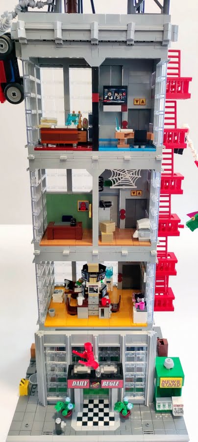 En sonunda binanın tümüne gelecek olursak, ön cephede ilk dikkat çeken şey, tepedeki dev bir Daily Bugle yazısı oluyor. Hemen altındaki bayrak direkleri ise minifigürleri yerleştirmenize olanak sağlayan alanlar olarak sete katkıda bulunuyor.