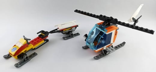 İlk modellerimiz kurtarma araçları. Kurtarma ekibinin setteki ağırlığı araç sayısından belli. Her türlü ulaşım şekli sağlanmış. Kızak, basit olmasına rağmen üç minifigürü yerleştirebileceğiniz yapısı ile oynanabilirliği yüksek bir model. Helikopter ise, çok standart bir LEGO City helikopteri. İki pervaneli olması biraz basit kaçmış olmakla birlikte, yanındaki sedye koyma yeri, kamerası ve farklı kabin arkası tasarımıyla hayal kırıklığına uğratmıyor. Yine de tabii helikopter yerine farklı bir modeli tercih ederdik.