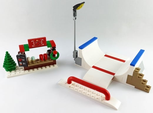 Diğer modeller ise yapılardan oluşuyor. İlk yapımız, küçük ama detaylı bir tasarıma sahip bir kahve standı. Arkada duran kazan ise kahve yerine özellikle Kuzey Avrupa’da yaygın olan sıcak şarap tarzı bir içeceğe işaret ediyor. Kayak pisti ise tam anlamıyla pürüzsüz. Bir merdivenle çıkıp kayabileceğiniz rampanın yanı sıra snowboard hareketleri yapabilmeniz için güzel bir boru yer alıyor. Yüzeyin fazla kaygan olması sebebiyle minifigürlerinizi rahatlıkla oynatabiliyorsunuz.