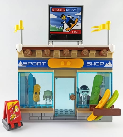 Setteki ikinci büyük model ise bir kayak malzemeleri dükkanı. Klasik bir LEGO şehir merkezi dükkanı tasarımına sahip olmakla birlikte tabelasındaki snowboard, çatısındaki kütükler ve tepedeki ekran ile farklılaşıyor. Keyifli bir model olduğunu söyleyebiliriz.