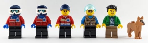 Minifigürleri iki grupta inceleyecek olursak, ilk grubumuz kayak merkezi görevlileri. İki sürücü, bir merkez görevlisi, bir helikopter pilotu ve bir mağaza görevlisi yer alıyor. Helikopter pilotlarının birisi kadın birisi de erkek. Merkez görevlisinin saç parçası şapka ile bütünleşik bir parça iken, gövdesi de pembe kıyafet detayıyla dikkat çekiyor. Mağaza görevlisinin ise sivil kıyafeti farklı rollere de izin verecek bir yapıda.